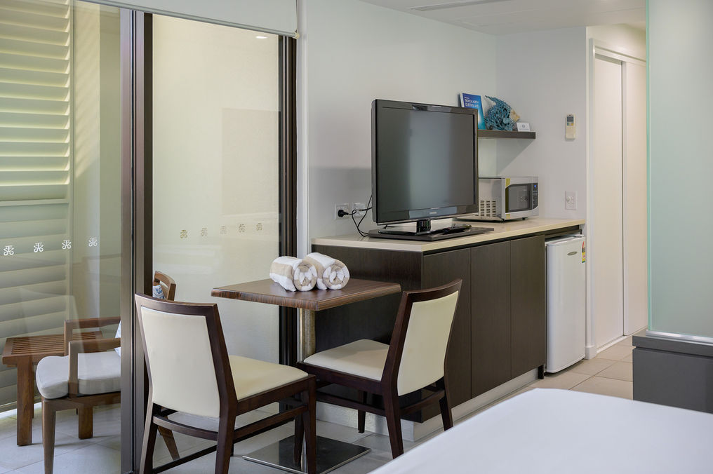 Soak in the tropical ambience and northern sunshine whilst enjoying a wonderful feeling of seclusion and privacy in apartment 161. This luxury studio apartment is a 1 bed, 1 bath, studio room and is the perfect way to enjoy a relaxing holiday at edge of the Coral Sea. This luxury apartment features a king size bed and wonderful spa bath in the ensuite. Step out to the private patio to enjoy the resort’s elegant open-air design, calming water features and lush tropical gardens that create an amazingly relaxed and peaceful atmoshpere.